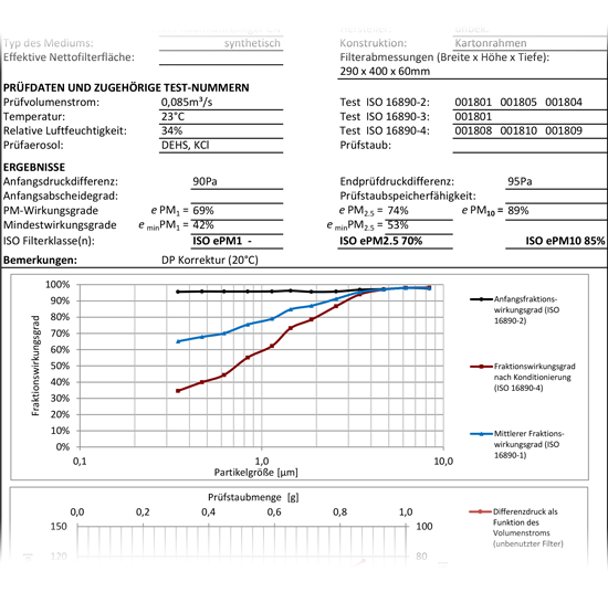 Das Produkt in diesem Beispiel erreicht gemäß der Betriebsanleitung in etwa einen Wirkungsrad der Klasse EN1822 E10 und wäre damit höchstens ein EPA Filter. Eine Messung nach EN1822 / ISO 29463 war wegen einer Vielzahl von Leckagen nicht möglich. Ein Test gem. ISO 16890 ergab gerade einmal eine Abscheideleistung von ePM2.5 70%. Damit qualifiziert sich dieser Filter für Hausstäube, Flusen, Textilfasern und Pollen. Für den Infektionsschutz ist ein solcher Filter nicht geeignet