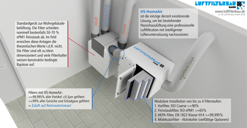 HS-HomeAir ist eine standardisierte, leicht zu installierende Upgradelösung, die durch ein mehrstufiges Filtersystem eine maximale Luftqualität zur Verfügung stellt.