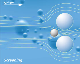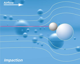 Impaction Effect: Heavier particles‘ moment of inertia is too big for them to follow the airflow running around the fiber. Those particles keep following their original path and therefore impact the fiber on it‘s air side. Inertia increases with the speed of the airflow, particle size and a decreasing fiber size.