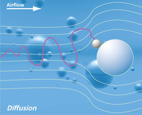 Diffusion Effect: Particles below 1 µm in size don‘t follow the airflow past the fibers. They are influenced by the Brownian motion: Molecules in the air make these small particles obtain a zigzag motion. When touching the fibers they will adhere to it. The possibility that these particles attach themselves to a fiber increases with a decreasing amount of speed and decreasing particle and fiber size.